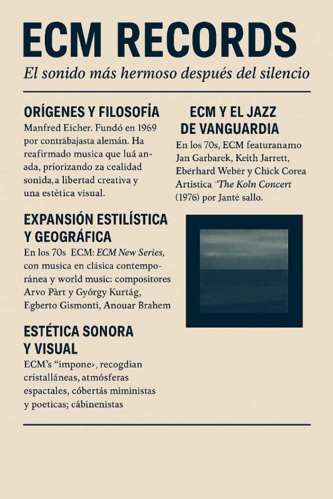Desde su fundación en 1969 por Manfred Eicher, ECM Records (Edition of Contemporary Music) se ha convertido en una de las casas discográficas más influyentes en la historia del jazz moderno, la música de cámara contemporánea y las formas experimentales. Con sede en Múnich, Alemania, el sello ha forjado una estética sonora y visual inconfundible, marcada por la pureza del sonido, la contemplación melódica y una propuesta editorial que prioriza la libertad creativa por encima de las tendencias comerciales.