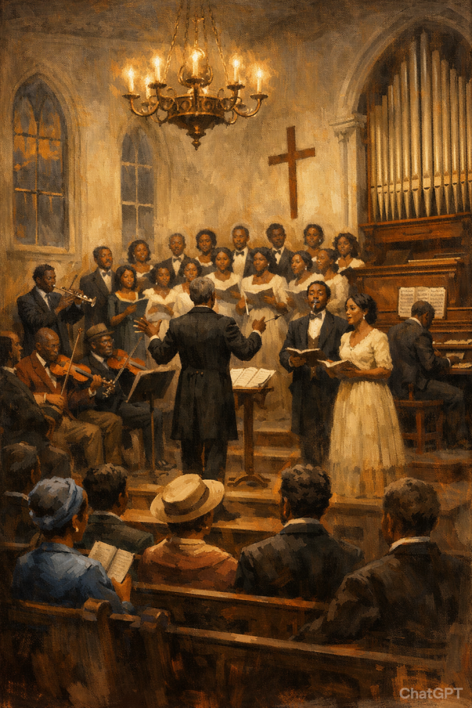 A partir de la década de 1820, las iglesias afroamericanas comenzaron a organizar conciertos dedicados a la música sacra, marcando un espacio cultural propio dentro de la vida urbana de Estados Unidos. Estos eventos combinaban interpretaciones solistas —a cargo de hombres y mujeres— con pequeños ensambles y, especialmente, números corales extraídos de oratorios y otras obras religiosas. Aunque se inspiraban en la tradición de los conciertos de iglesias blancas, los músicos negros introdujeron un énfasis distintivo en la expresión coral colectiva.