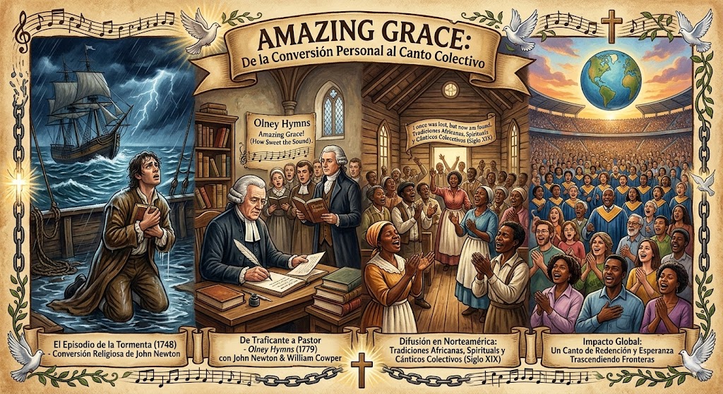 La historia de Amazing Grace, uno de los himnos religiosos más conocidos del mundo anglosajón, está profundamente ligada al complejo contexto histórico de la esclavitud atlántica y a las transformaciones espirituales del siglo XVIII. Su autor, John Newton, nació en Londres en 1725 y pasó su juventud vinculado al mar. Tras una vida turbulenta que incluyó su participación en el comercio de esclavos, experimentó un proceso de conversión religiosa que marcaría el rumbo de su existencia.
