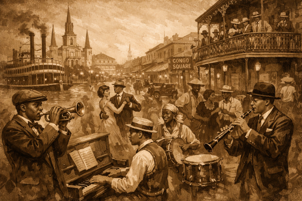 El jazz surgió a comienzos del siglo XX en la ciudad de Nueva Orleans, en el estado de Louisiana, en el sureste de Estados Unidos. Sin embargo, su aparición no puede explicarse como un simple acontecimiento musical ni como la creación de un solo artista. El jazz fue el resultado de un proceso histórico mucho más profundo, en el que confluyeron migraciones forzadas, transformaciones sociales y el encuentro entre tradiciones culturales provenientes de distintos continentes.