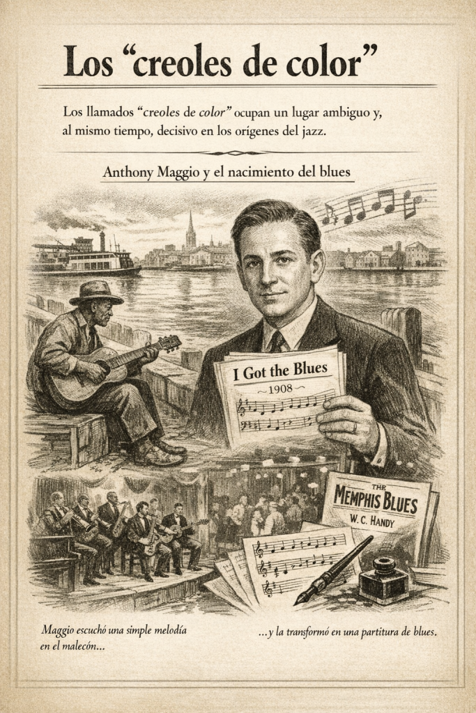 Los llamados “creoles de color” ocupan un lugar ambiguo y, al mismo tiempo, decisivo en los orígenes del jazz. Durante años se sostuvo una idea casi lineal: que los músicos criollos del centro de Nueva Orleans habrían aprendido el nuevo lenguaje directamente de los músicos afroamericanos de uptown. Pero la realidad, como suele ocurrir en la historia del jazz, es menos ordenada y bastante más rica. El intercambio existió —la circulación a través de Canal Street fue real y constante—, aunque no fue el único canal. También circularon ideas a través del papel: partituras, arreglos, reducciones para piano, que fijaban —aunque de manera parcial— ciertos rasgos del naciente blues.